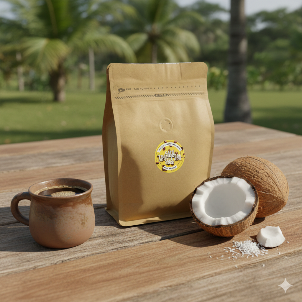 Una mezcla armoniosa entre el café de montaña y el coco orgánico natural, expresando una textura suave y un sabor fino a dulce de coco, un café exclusivo, diferente, cálido y envolvente.